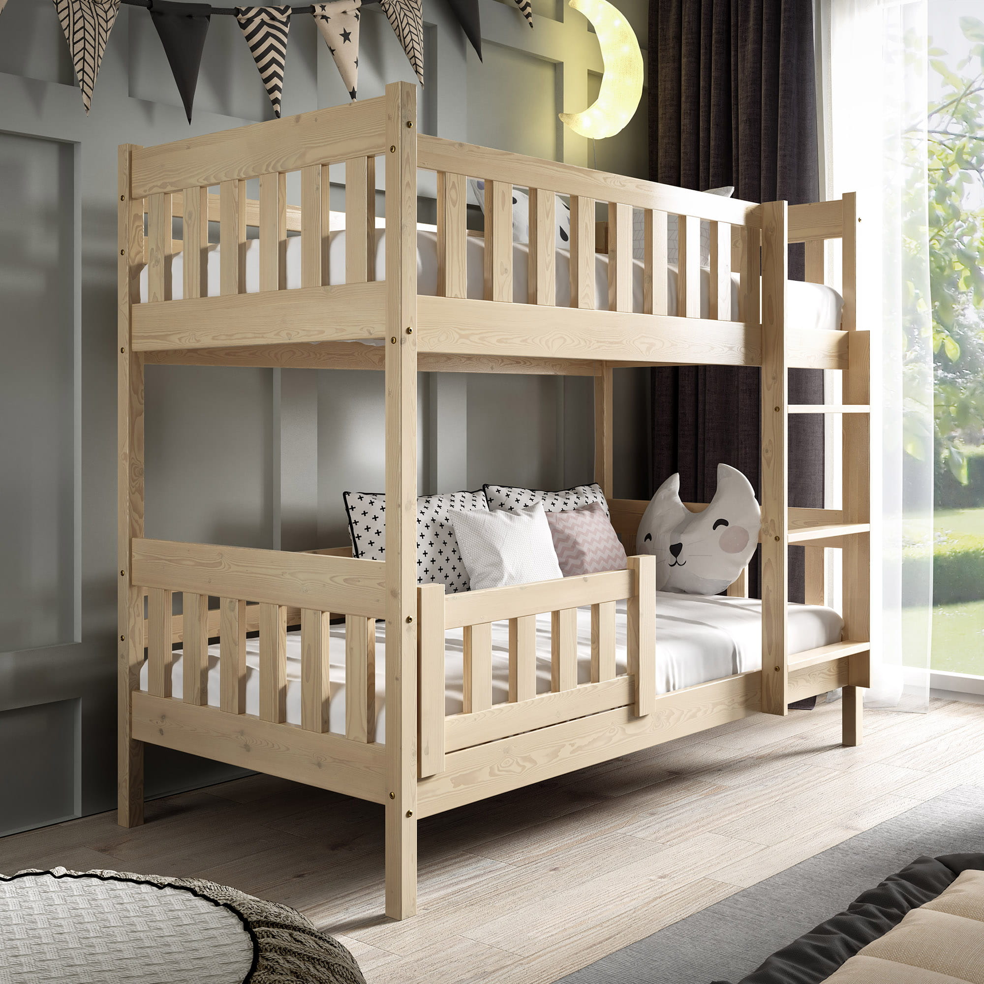 Die Leiter mit breiten Stufen bietet einen bequemen und sicheren Zugang zum oberen Bett. Die aus hochwertigem Kiefernholz gefertigte Leiter ist ein integraler Bestandteil des Bettes. Das Kind kann leicht auf das obere Bett klettern.