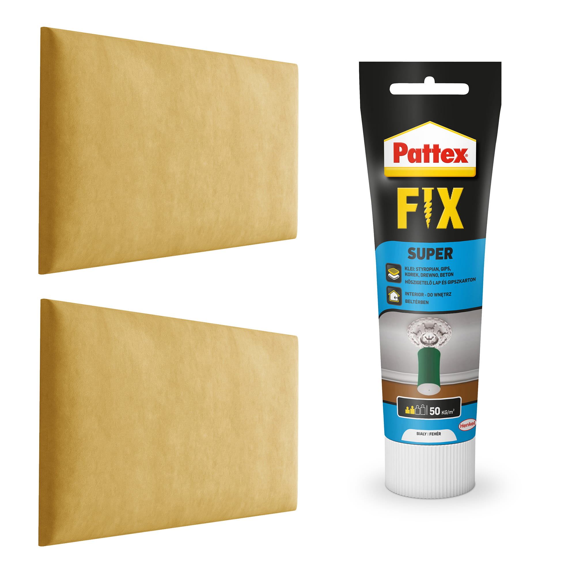 Die Montage der gepolsterten Paneele erfolgt mit Montagekleber, der im Lieferumfang des Möbelsets enthalten ist.